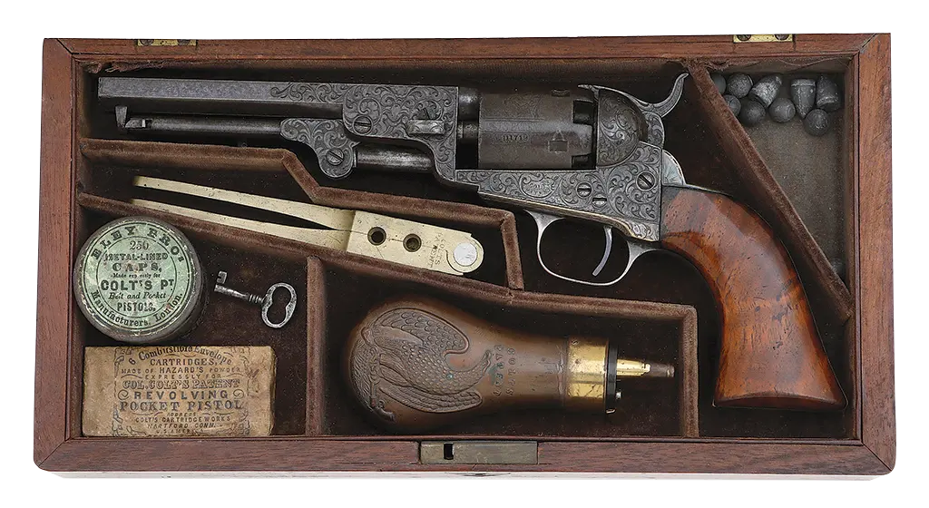 Very Fine Cased & Gustave Young Engraved Colt Model 1849 Pocket Revolver