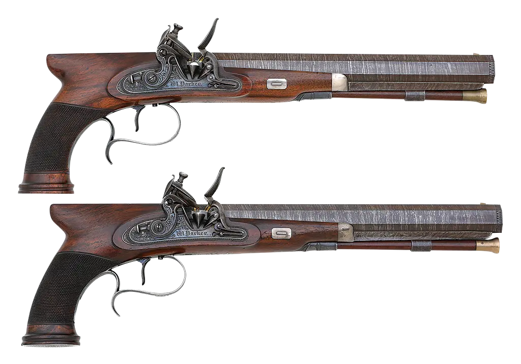 Excellent Pair of British Saw-Handle Flintlock Dueling Pistols by William Parker